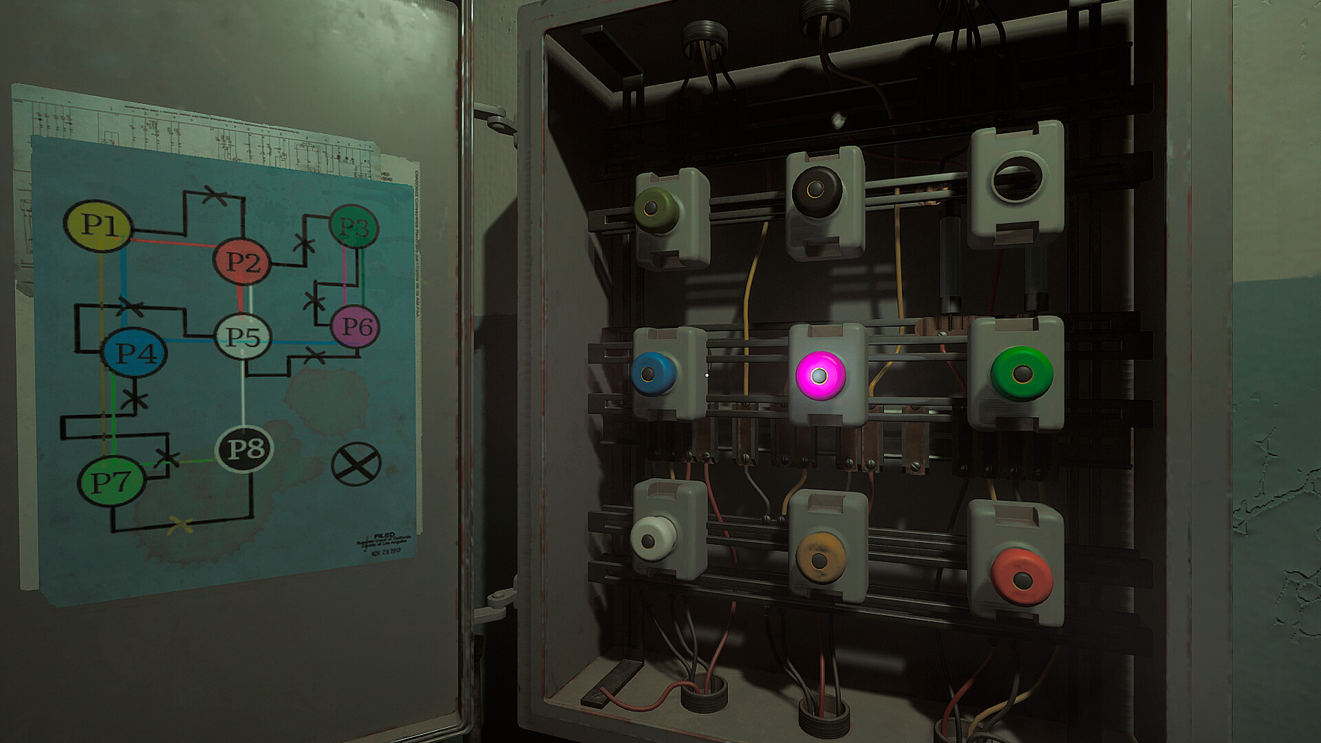 По законам жанра, нам предстоит бегать по уровню, читать записки и решать головоломки, а пока мы будем их решать вокруг будет мигать свет, слышаться всякие страшные звуки и так далее. Впрочем, головоломками это сложно назвать. В первом случае нам предстоит вправить пакетники в щитке, дабы зажечь свет в дальнем конце коридора. Скорее всего на этой головоломке вы застрянете надолго, если заранее не знать, что делать. Но это не потому что вы глупы, а потому что головоломка конченая. Она контринтуитивна, и даже не будет существенным спойлером, если я раскрою алгоритм её, так сказать, решения. Чтобы найти правильную последовательность пакетников, вам нужно изучить все планы эвакуации. Электрощитовая на всех отмечена разным цветом. Пакетники с этими цветами и нужно вправить. Как это связано меж собой? Никак, просто автор так придумал. Не нужно искать по школе никаких запасных «пробок» или разбираться в хитросплетении проводов меж узлами: ничего из того, что было бы интуитивно понятно. Вместо этого, нам предлагают почти что пиксельхантинг. Может, я бы проглотил это, если бы изначально эта головоломка не была нормальной. Откуда мне знать? Оттуда. На официальном скриншоте игры в стиме осталась схема для запуска электричества, но в конечной (или всё-таки конченой) версии игры этой схемы на внутренней дверце щитка уже нет Магия. Мистика. Фантастика. Фэнтэзи.