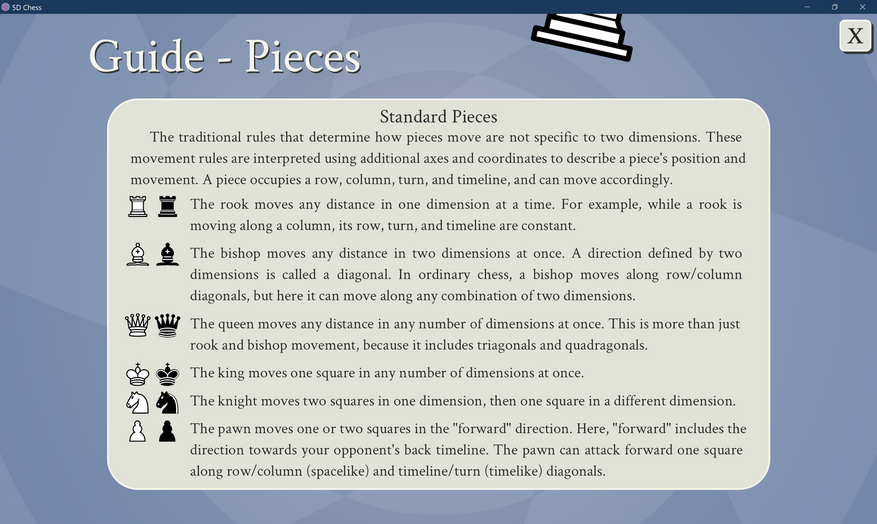 - Ладья, способная двигаться на любое количество клеток по прямой, теперь может пронзать время и пространство подобно копью. Она может проехать сколько угодно досок вперёд или назад во времени, а также «вбок» через любое число параллельных миров на таймлайне, оставаясь на той же пространственной позиции, или перенестись через несколько клеток, как обычная фигура. Вот только — именно что «или»: при перемещении по новым осям ладья останется на своем тайле по оси пространства, то есть на доске (в точке прибытия, само собой, той же ладьи или иной фигуры вашего цвета быть не должно).