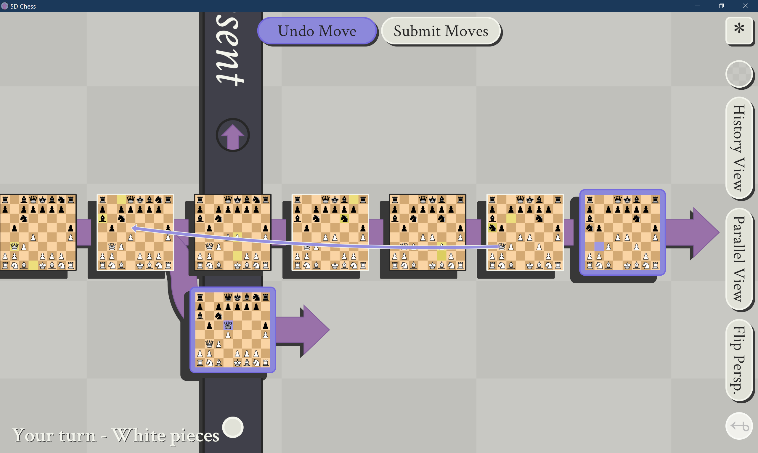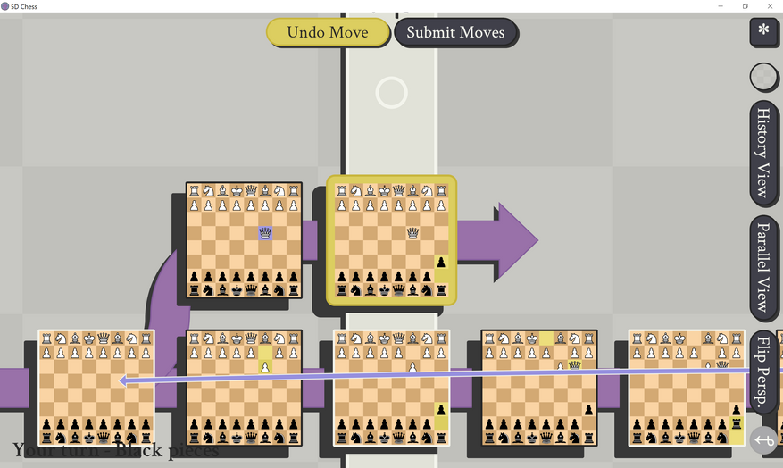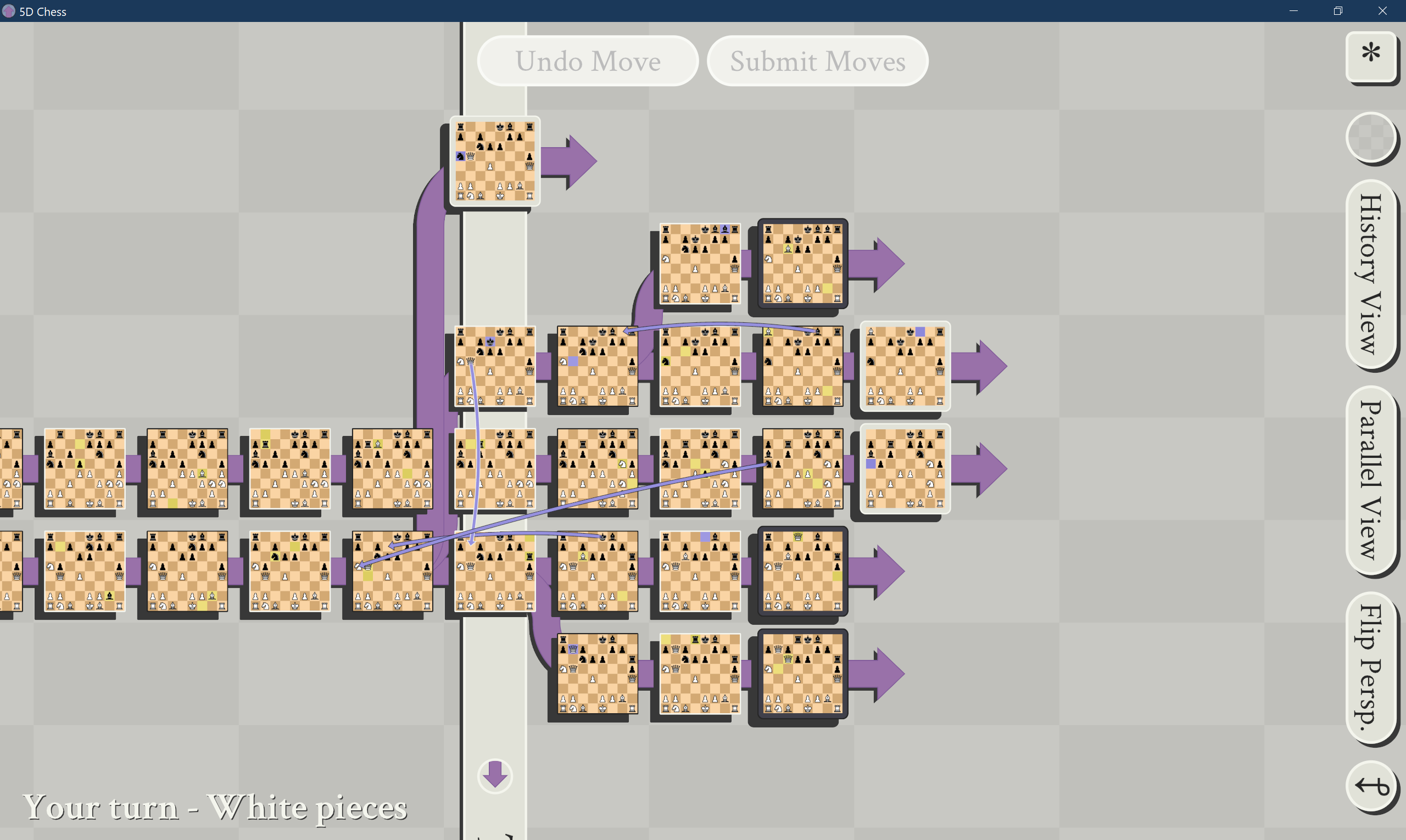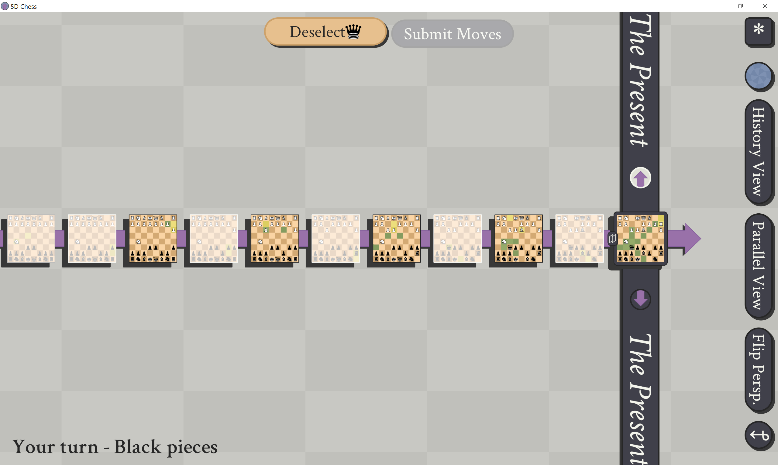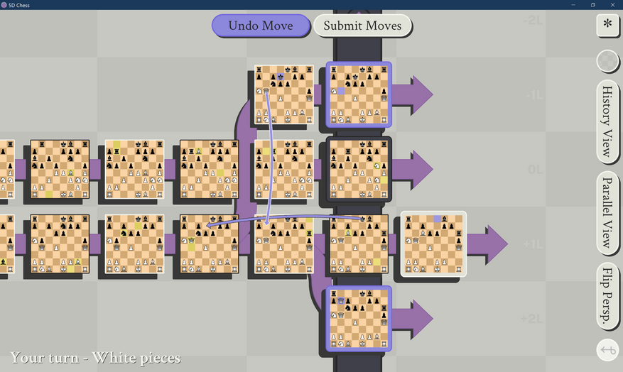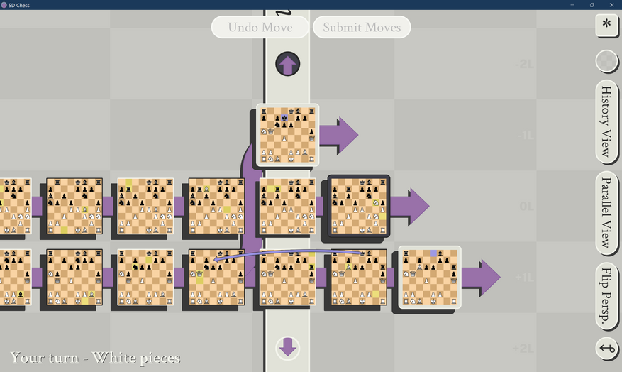 Например, ход черных ферзём на несколько ходов назад может привести к ситуации, когда на одной доске окажутся сразу два ферзя противника. Рискованный манёвр, но при грамотной игре, если удастся продержаться, пока таймлайны не сравняются — такое преимущество противника можно обернуть в свою пользу, используя дефицит фигур на изначальной доске для создания контругроз в других измерениях.
