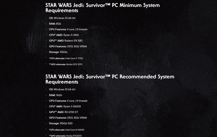 Это немного странно, потому что, помимо внушительно размера файла, Star Wars Jedi: Survivor не является особенно требовательной игрой для ПК. Минимальная конфигурация, необходимая для игры, — это комбинация Ryzen 5 1400 и RX 580 с 8 ГБ оперативной памяти. Рекомендуемые характеристики ПК, естественно, немного выше, запрашиваются Ryzen 5 5600X и RX 6700 XT с не менее чем 16 ГБ ОЗУ, но это все еще не является чем-то необычным для большой игры AAA-класса, выпущенной в 2023 году. Просто требования к жёсткому диску здесь являются аномалией, и мы надеемся, что они смогут в конечном итоге исправить это до более разумных размеров.