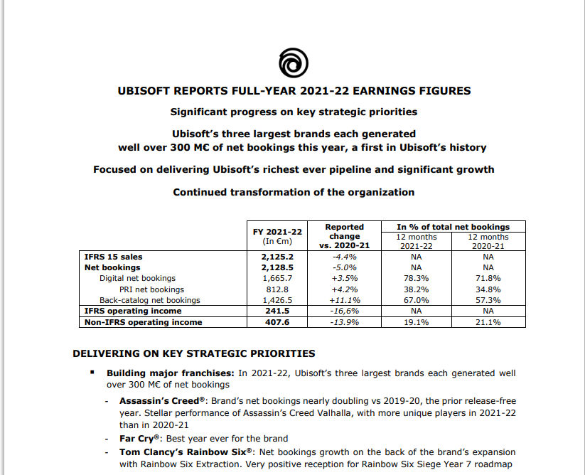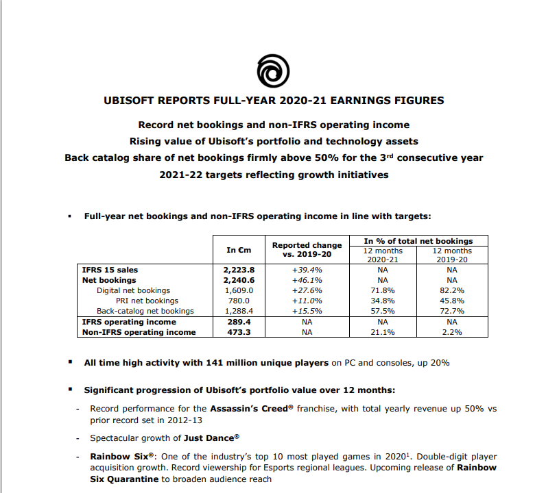 В отчете за 2021 год компания сообщает о запуске Rainbow six Extraction и положительном принятии дорожной карты 7 года поддержки: