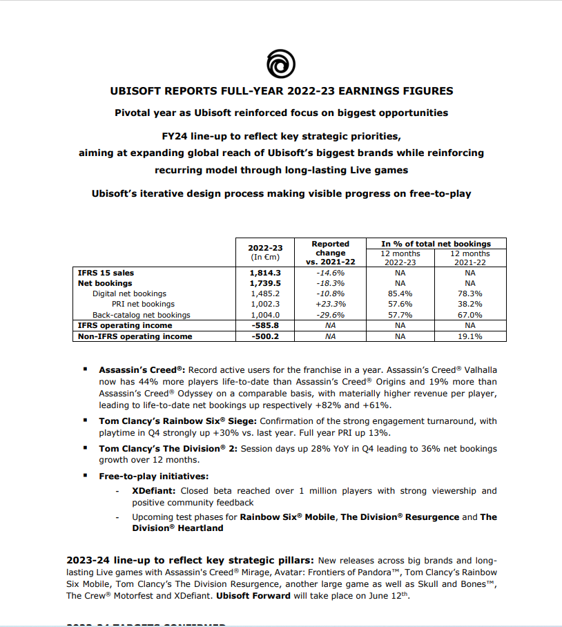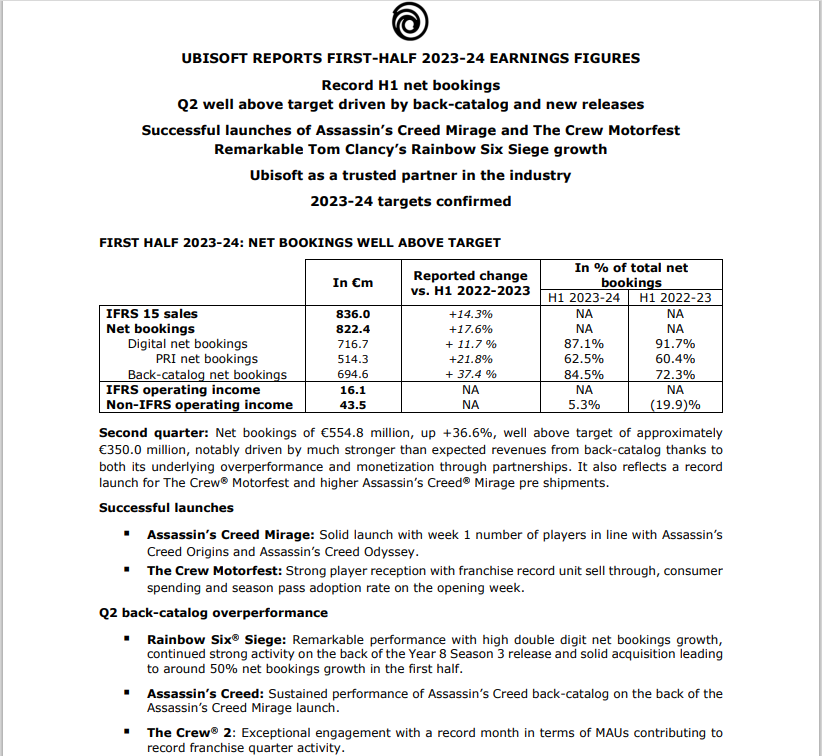 Стоит также отметить что Ubisoft удалось вернуть часть потерянной аудитории в 2023 году и средний онлайн в течение этого года был в районе 60-70 тыс. игроков что в свою очередь способствовало увеличению чистой прибили на 10%.