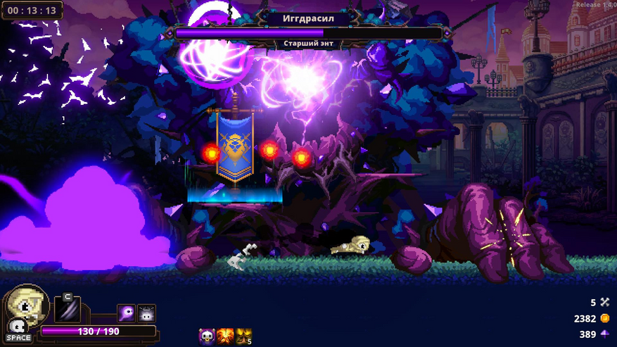 Вы не знаете, какой череп выпадет в следующий раз, а собирать кости — дело крайне долгое и утомительное. Мало фарма? Получайте повторяющиеся локации и побеждайте главных боссов снова и снова. Я не шучу. Мини-боссов, которых силой завербовали из вашей армии, вам достаточно победить лишь раз, а вот мини-боссов и боссов врагов будьте добры, побеждайте каждый раз, если хотите пройти дальше. Дабы не быть голословным, вот вам скриншоты боев со старшим энтом Игдрасилем.