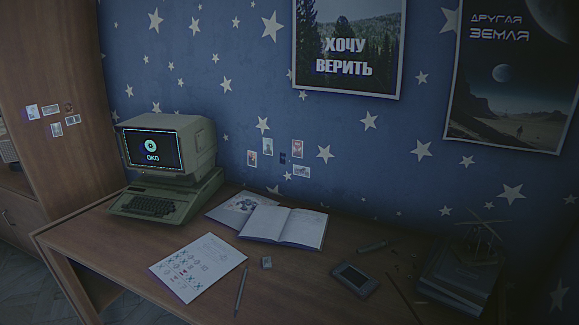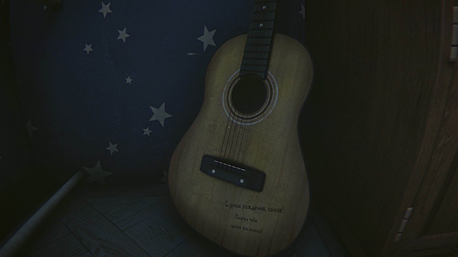 Вторая локация при её внимательном изучении прописывает нам протагониста очень детально, начиная с пелёнок. Семейные фото, наклейки на холодильнике, стенах и шкафу, набор радиолюбителя и гайки с болтиками, разбросанные всюду, подаренная и подписанная родителями гитара — любителям узнать своего героя тут есть, где разгуляться. Можем мы и пощупать быт протагониста, побродив по комнатам, решив с ним задачку по математике, пройдя пару — тройку каток в видеоигры на его компьютере либо прослушав на нём музыку, побросав мяч на кухне, узнав вес на домашних напольных весах и смачно грохнув бутылку лимонада на родительском ковре, за что герою наверняка потом влетит. А главное — дети 80-х и 90-х в этой локации легко могут узнать себя через Игната, который является обычным ребёнком своей эпохи, уж больно похожей на нашу.