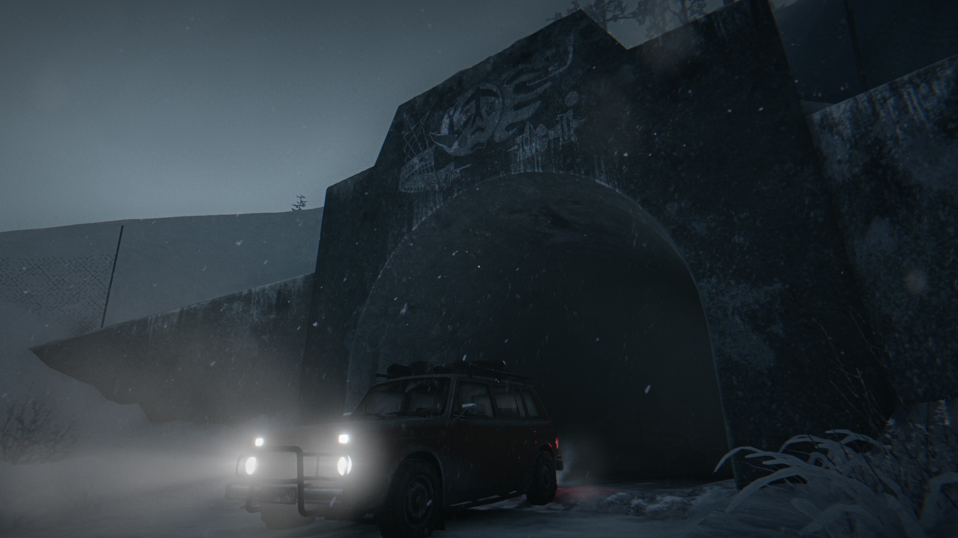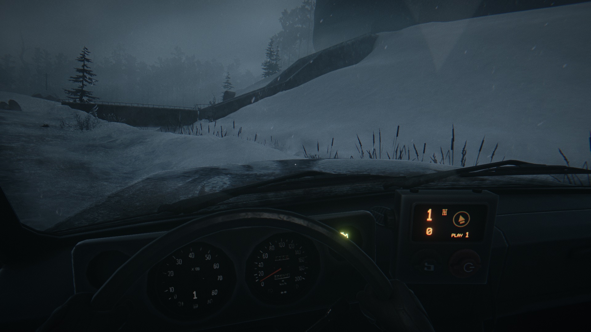 Езда на автомобиле приемлемая. Можно предъявлять за звук двигателя или дубовую физику кузова. Но перед нами не конкурент GTAV или SnowRunner. Ощущается тяжесть транспорта, различные свойства дорожного покрытия. По снегу едем медленнее, снег с ледяным настом под ним требует включения пониженной передачи. Нам дают съехать с основной дороги, побороздить по разухабистому заваленному снегом грунту, потыкаться в невидимые стены у некоторых объектов, например, у реки. Для разработчика одиночки, который езду от первого лица вводит в геймплей впервые — результат нормальный. Взаимодействие с автомобилем реализовано на базовом уровне — ручное переключение передач, включение дворников, плеера, зажигания. Интерактива в стиле Pacific Drive не ждите. К зеркалу заднего вида машины прикреплён кулон, явно важный для пацана, и виденный нами в его комнате на второй локации. Хотелось бы побольше таких черт «характера» у авто.