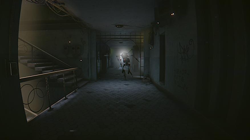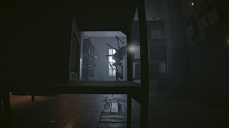Стелс также реализован плохо. Самая эффективная тактика — не прятаться от врага, а быстро бежать от одного шкафчика до другого. Затем прятаться в шкафу, выжидать, когда недруг удалится, и снова бежать до следующего шкафа. Такой геймплей не увлекает. Особенно, если ты не понимаешь, куда бежать. Хорошо бы дать геймеру небольшие участки локации, куда робот пробраться не может, дополнительные механики, типа звуковых мин для отвлечения врага, которые можно включить ручным активатором, даже сидя в шкафу. Искусственный интеллект противника реализован вполне неплохо. Злыдень эффективно патрулирует округу и молниеносно реагирует на громкие звуки (типа хруста стекла под ногами или громкого сигнала лифта). Если вы сдуру включите фонарик, прячась в шкафу, то противник даже на расстоянии увидит то, как свет выбивается из шкафа, и неминуемо надерёт вам пятую точку. Классная деталь в работе ИИ.
