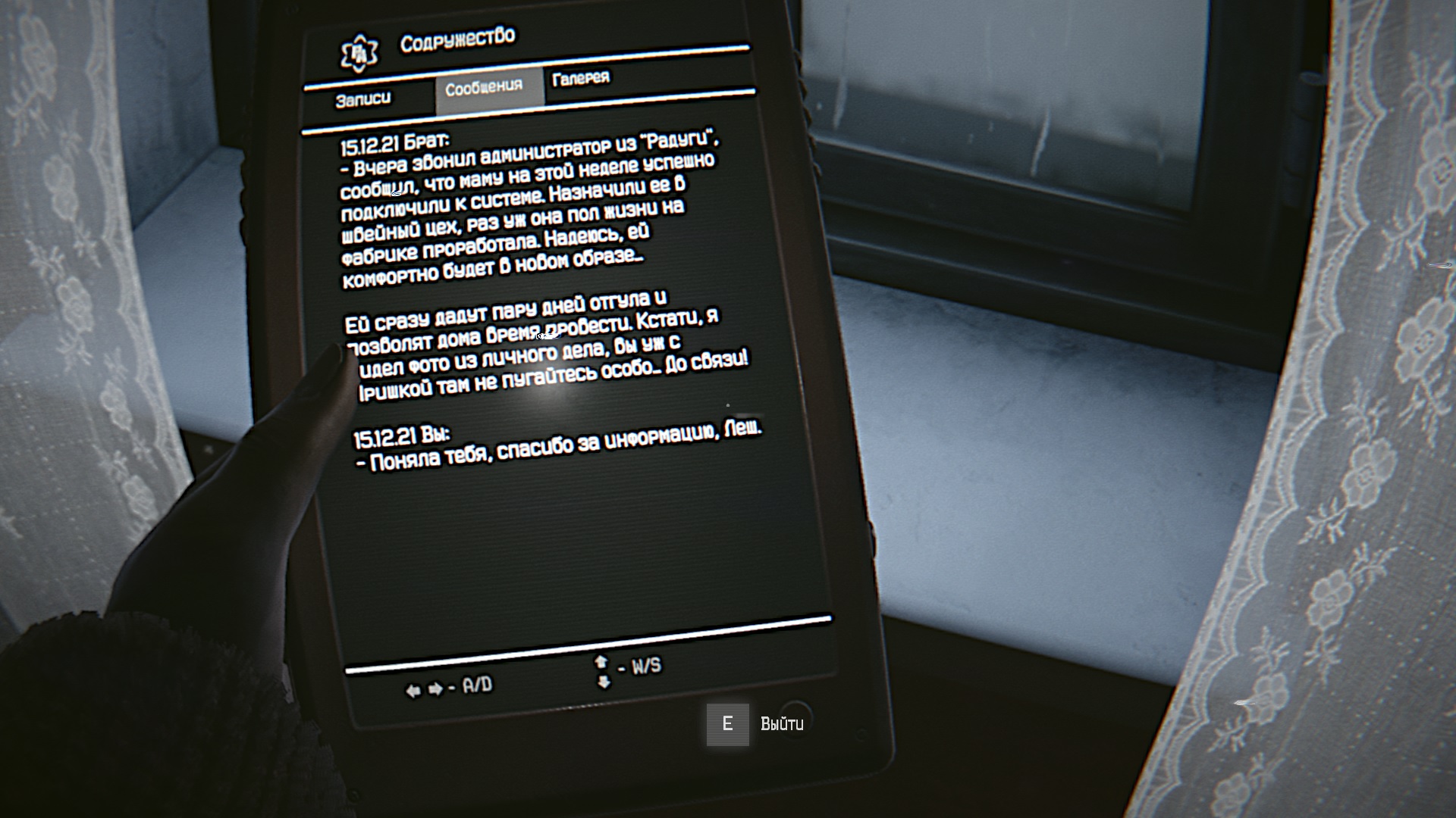 Информации про Храза в демо я не увидел. Является ли он искусственным интеллектом — компаньоном, наподобие такового из Atomic Heart. Либо с протагонистом кто-то общается через динамик. Это пока не понятно. На данном этапе Храз выступает рассказчиком, предоставляющим геймеру недостающую информацию. С Николой Игнат познакомился уже в постапокалипсис, случайно выйдя с ним на связь. Данный персонаж занимается активными исследованиями артефактов прошлого, благодаря чему мы получаем важные сведения по ЛОРу. Самый большой интерес среди второстепенных лиц в демо у меня вызвала соседка тётя Валя, о которой мы узнаём вначале из сообщения дедушки протагониста, а потом из внутренней переписки её семьи. Если совместить эти знания с видеоархивом первой локации, а также припомнить ЛОР прошлой игры разработчика под названием 7th Sector, то картина вырисовывается интригующая.