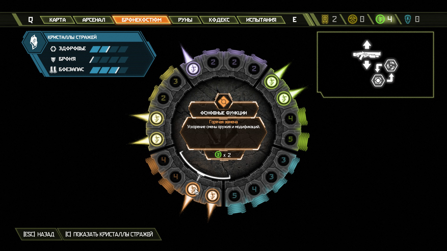 Моё отношение к таким новшествам следующее: ничего не имею против прыжков и вертикального геймплея, но только если он не идёт во вред погружению. Одно дело, если бы игрок, зацепившись за стену, вёл стрельбу с одной руки, но тут этого нет. Вместо этого — унылое лазанье по стенам, отнимающие только время. Далее идёт прокачка оружия и персонажа. Находя разные ресурсы, игрок будет прокачивать альтернативную стрельбу из оружия или увеличивать здоровье.