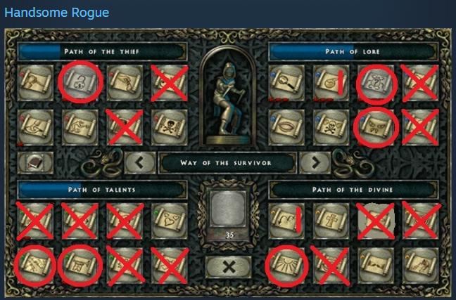 | Пример ветки навыков вора, с пометками от автора гайда о том, какие навыки нужны, а какие — нет. Красная палка обозначает навыки, которые стоит вкачать лишь на единичку. |