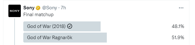 В ходе нескольких недели голосований, в финале оказались две игры от одной студии — SCE Santa Monica Studios, которые выпустили переиздание God of War и сиквел God of War Ragnarok. На момент написания данной новости, последняя пользуется чуть большей популярностью среди аудитории данной соцсети и опережает первую часть лишь на 3,8%.
