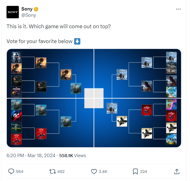 На официальной странице Sony в соцсети X (Twitter) появился большой опрос, в котором они поинтересовались какую игру на PlayStation они считают лучшей. Компания предложила выбор из 16 игр, которые были разработаны внутренними студиями.