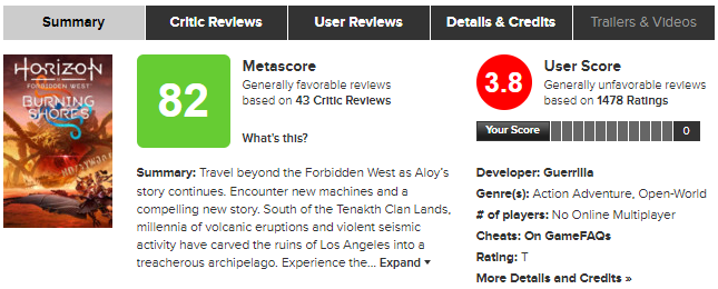 Дополнение Burning Shores для Horizon Forbidden West, вышедшее совсем недавно, вызвало огромное недовольство у игроков, что привело к снижению оценки dlc на сайте Metacritic. В итоге это привело к тому, что компания Sony, которая очень ревностно относится к оценке своих игр, заставила Metacritic изменить свои правила.
