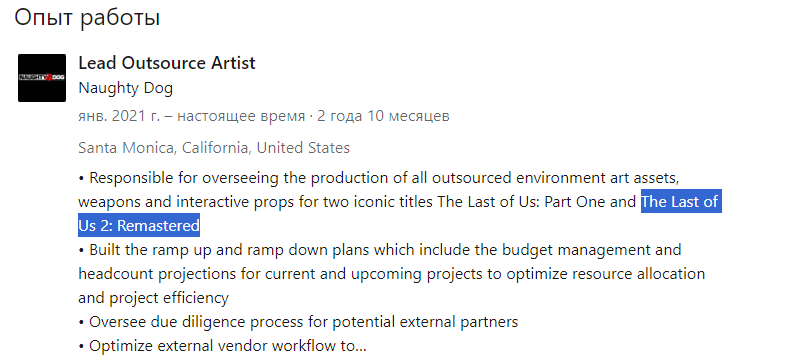 И вот в добавок к многочисленным слухам в сети нашли небольшое подтверждение о том, что работа над ремастером The Last of Us 2 всё-таки ведётся. В резюме главного аутсорс-художника Марка Пэджэрилло отмечено, что парень следит за выполнением работы над моделями оружия и других предметов для взаимодействия, которые передаются на аутсорс. Так же указаны и сами проекты, к которым относятся эти модели. А именно недавний The Last of Us: Part I и ещё официально не представленная The Last of Us 2: Remastered. Создание которой, судя по всему, ведётся для PS5 и PC.