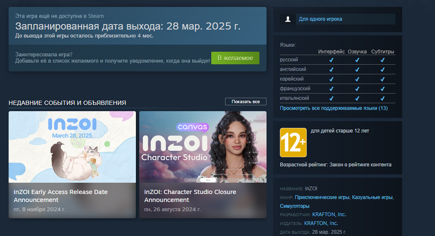 Создатели ожидаемой игры inZOI, которую после анонса начали называть «убийцей симулятора жизни The Sims», представили полноценный список языков, доступных в игре, в онлайн-магазине Steam.