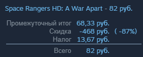 Игра была приобретена во время распродажи и обошлась в 82 рубля. Покупка в другое время обошлась бы в 536 рубля и 33 копейки. Если брать вне распродажи, то цена мальца кусает, но с другой стороны будучи приобретённой по скидке, игра с лихвой компенсирует вложения. Как подарок другу, на праздник, который любит подобный жанр или же чтобы побаловать себя. Цена на момент написания текста составляла 550 рублей в steam.
