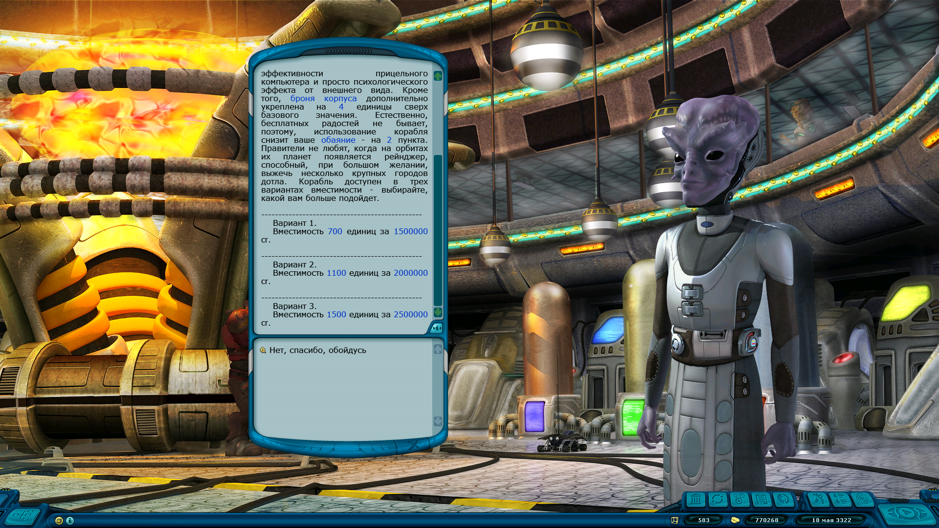 Игру проходил за торговца и логично предположил, что большая вместимость корабля пойдёт на пользу и потому взял вариант номер 3. Корпус вместимостью в 1500 единиц обошёлся в два с половиной миллиона кредитов. Учитывая технологию корабля свободно перемещаться по карте это казалось хорошей идеей, но всё вышло не так. В виду того что попутно прокачивался путь пирата, было выдано задание по ликвидации одного корабля и всё бы ничего, но разработчики видимо так душу отвели. Мало того, что этот корабль постоянно прыгал из системы в систему из-за чего сам процесс его поиска был утомительным, так до кучи корабль цели имел ускорение из-за чего догнать его было чисто механически невозможно.