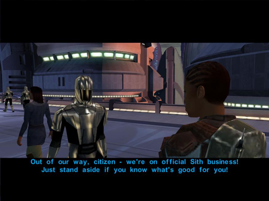 Так вот, к чему все это? А к тому, что восприятие 3d-графики, как и видеоигр, было совсем иным. И, например, после Neverwinter Nights модели персонажей в KotOR казались очень детализированными, и поэтому более живыми. Игра воспринималась куда более графонистой, чем «Морровинд» или «Готике 2», но в то же время локации выглядели бедно уже тогда. То есть KotOR частенько ощущался каким-то «стерильным». Игру можно смело было назвать одной из самых красивых игр 2003 года, но скорее за счёт шейдерных эффектов и неплохой лицевой анимации. При этом максимальные настойки графики были доступны далеко не каждому. В 2006 году KotOR уже воспринимался по-другому. Уже в 2004 и 2005 годах выходили куда более продвинутые в техническом плане игры. Так что в момент моего первого прохождения, эта игра графикой уж точно не впечатляла.