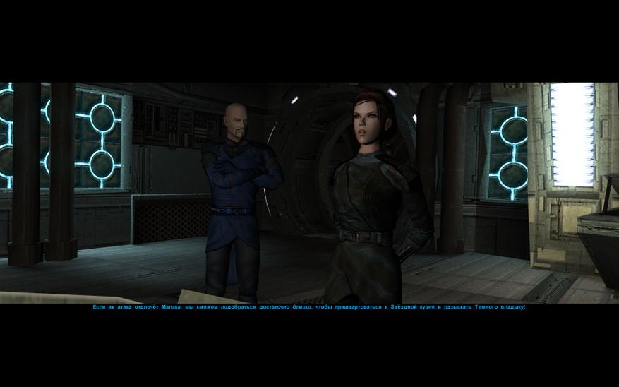 - Неизвестный мир. Именно здесь мы и выбираем концовку игры. Причем абсолютно неважно, чем главный герой занимался во время прохождения. Проходится довольно быстро, но сделана довольно атмосферно. Дальше только финальное сражения на «Звёздной кузне», победа над Малаком, решение судьбы Бастилы, светлая или тёмная концовка.
