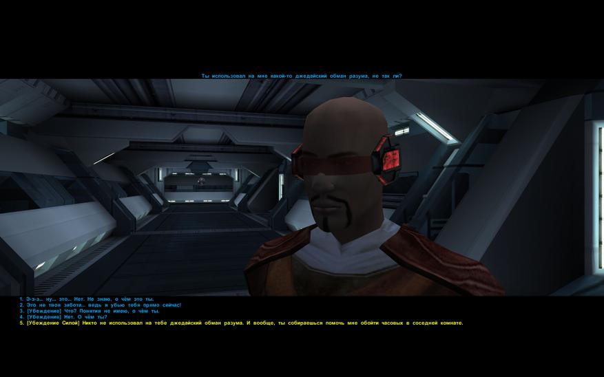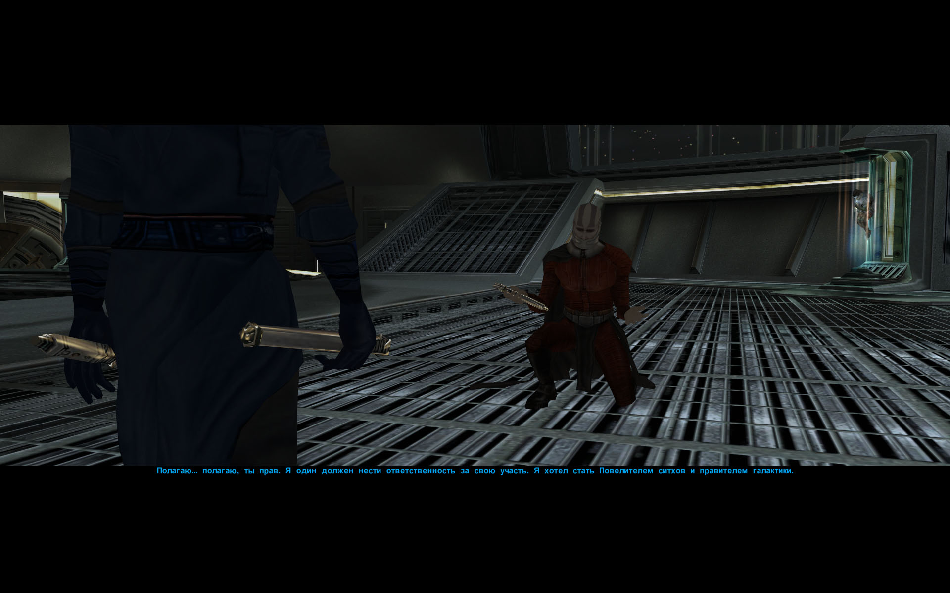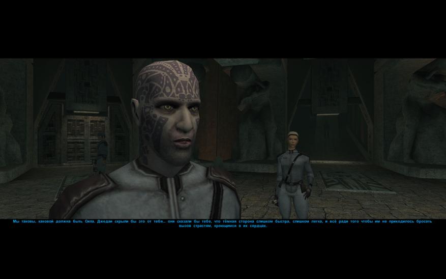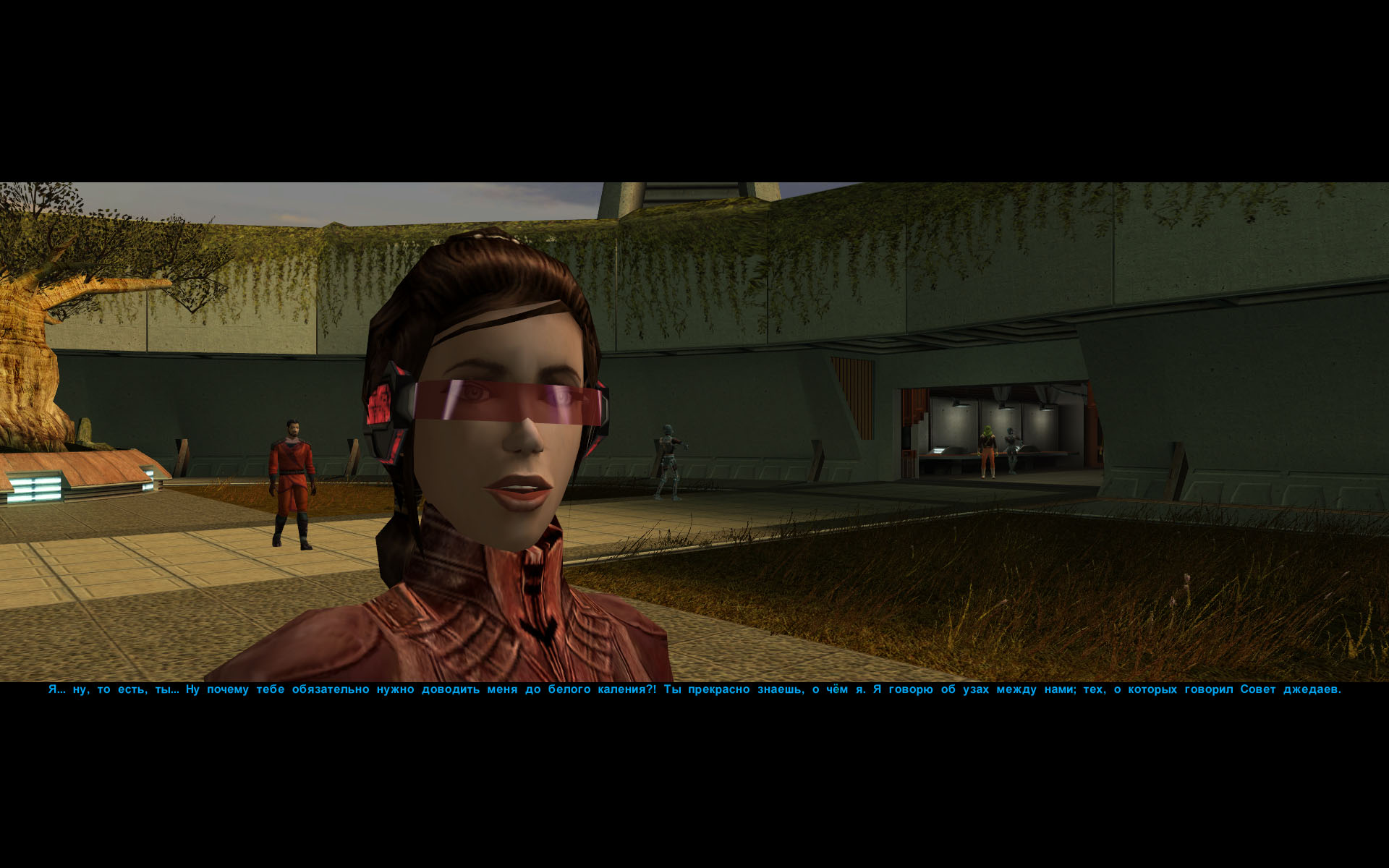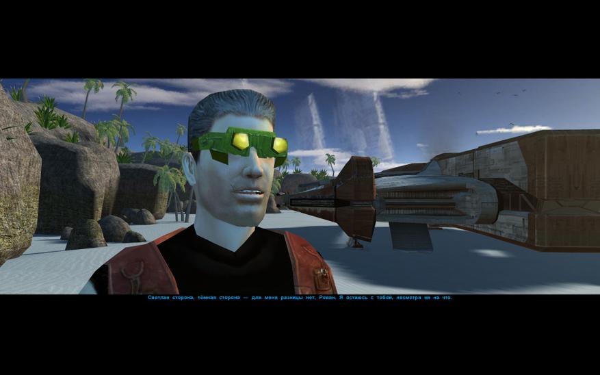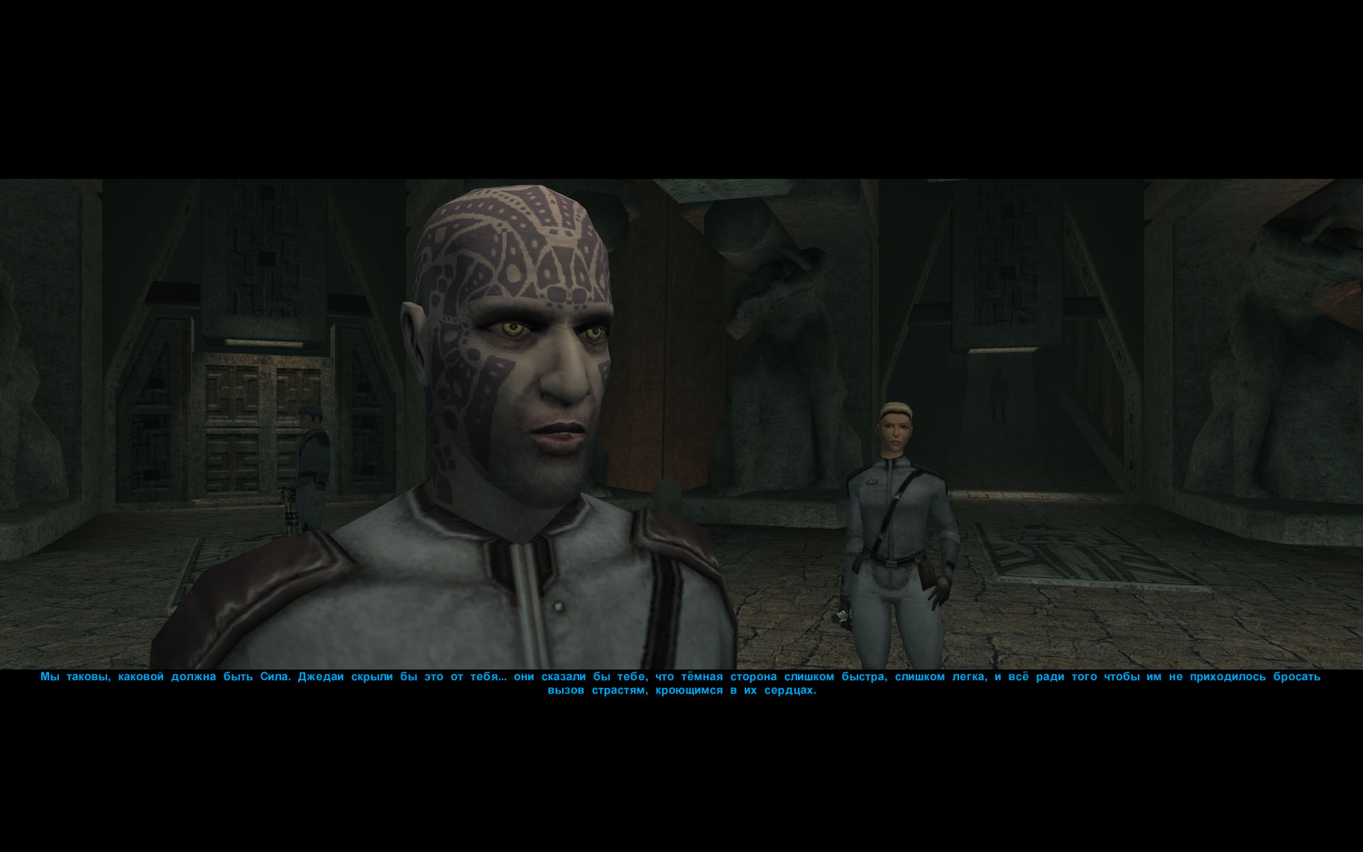 В этот раз я решил попробовать проходить немного нестандартно. Поначалу я совершал откровенно злые поступки, и в итоге получил максимальное значение тёмной стороны где-то на середине прохождения. Затем мой Реван резко осознал ошибочность своих поступков, и потихоньку начал исправляться. И к встрече с Батилой в храме на неизвестном планете, я подошёл практически идеальным серым джедаем (значение было примерно посередине). И что получилось в итоге? Да ничего. Именно в этой сцене, по сути, и решается концовка игры. То есть можно всю игру быть настоящей мразью и отморозком, но под конец заявить, что мы за республику и совет джедаев. И вообще Ревана больше не существует. С другой стороны Бастила своей бравадой может за пару минут склонить на тёмную сторону нашего «савятошу». Вот ведь, действительно, у них какая-то уникальная связь. В этом плане игра, конечно, разочаровывает. Тем более, что и какого-нибудь нейтрального варианта здесь не предусмотрено. Ну может быть если её убить в конце, а не вернуть на светлую сторону. Я, кстати, в этот раз не пытался развивать с ней отношения, а она всё равно в конце в любви признается. Но всё равно игра очень хорошо позволяет отыгрывать разные стороны силы на протяжении всего прохождения. Пусть это и не на что не влияет в конце игры.