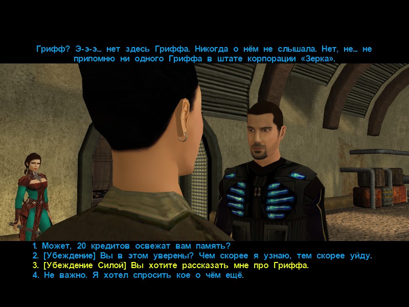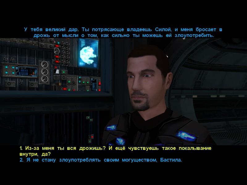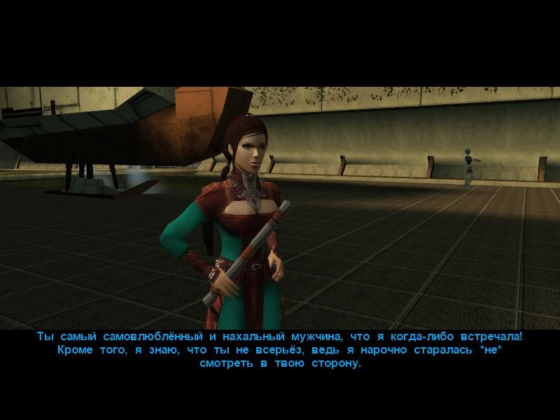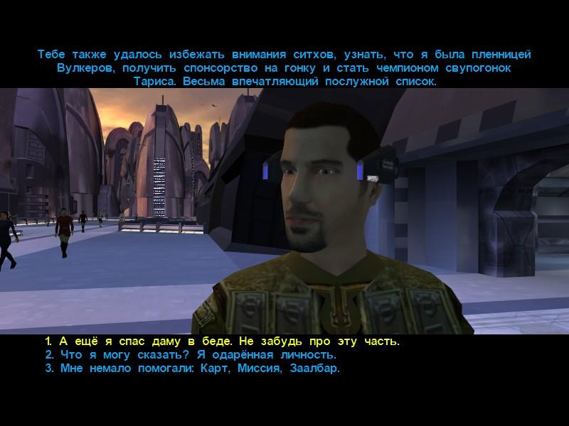Фирменные диалоги BioWare в KOTOR возведены в Абсолют. Ваши напарники общаются с вами, общаются между собой, активно встревают в диалоги и могут даже начать спор посреди вашего диалога, а их вмешательство способно привести к совершенно новому результату. Провал проверки на дипломатию, может запустить уникальный диалог напарника (или даже двух), исправляющий вашу ошибку. Если вам нравился Mass Effect в первую очередь из-за диалогов, то KOTOR стоит того, чтобы составить мнение об игре. Играя в KOTOR, вы легко обнаружите сходство Mass Effect, но с куда большей глубиной образов и событий. Проведем небольшое сравнение. Чем больше вы узнаете жестокого наемника Урднота Рекса, тем более благородным и просвещенным рыцарем кроганов он пред нами предстает. Угадывающийся же прототип, мандалорианский наемник Кандерос Ордо, воспринимается истинным благородным дикарем, подобно Черному Абдуле родившимся не в свое время. Он благороден, честен, мудр, но способен совершать просто чудовищные поступки и с достоинством нести груз ответственности за них. Рост этого персонажа за две игры колоссален. Кайден Аленко — человек со сложным характером и прошлым, так и не проявившимся за три игры. Карт Онаси (даже озвученный тем же актером), на протяжении всей игры занимает особое положение в команде игрока, постоянно мечется между своими положительными сторонами и, испорченным тяжелой жизнью, характером. Исключительно живой персонаж, одновременно и притягательный и раздражающий. Лиара Т'Сони, занимающая в команде должность удаленной от социума отличницы и пай девочки, слишком удачно укладывается в этот образ и даже теряет часть очарования, когда со второй части ее лишают присущих этому образу странностей. Бастила Шан — топ красотка BioWare — сочетает в себе столько качеств зазнавшейся отличницы, что только можно уместить в одном персонаже. Она одновременно мудра и наивна, умна и туговата на юмор, отважна и уязвима, целомудренна и страстна. Яркая, но подавленная личность, которую вам предстоит раскрыть в одной из лучших романтических линий в истории RPG. Как бы я не любил первый ME, он всегда казался мне ужатым и вторичным после KOTOR.