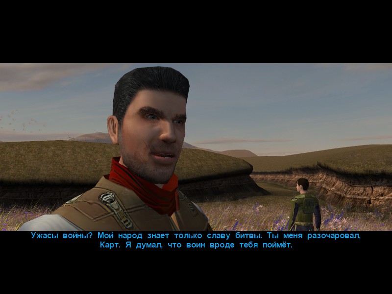 Вторичность эта разумеется не в упрек ME, а совсем наоборот успешный пример применения удачных наработок. Ведь и сам KOTOR пусть не как игра, а художественное произведение обладает должным уровнем вторичности. Той вторичности, что бывает уместна, будучи щедро приправленной оригинальностью. Чего только стоит кровожадный дроид-ассасин — отсылка к Бендеру! Джухани — кроткая кошкожена очень вспыльчивой расы, гармонично сочетающая добрый нрав и расовую склонность к вспышкам агрессии. Местный Чубака, Залбар, — мудрый варвар, представитель мудрого варварского племени, с очень специфическим кодексом чести и очень непростой личной историей. Настоящий повзрослевший ребенок, Миссия — девочка все еще с трудным детским характером, но очень умная и понятливая. Джоли Биндо — старый наставник, серый джедай-чудак, ветеран первой империалистической, сбежавший от человечества, но не отвернувшийся от самой страшной ему угрозы. Вроде как вы даже знакомы со всеми типажами характеров, но ко все им применены огромные усилия, чтобы убрать даже намек на какую-либо картонность. Даже зануда Карт получился интересный и крутой! Актеры, художники, сценаристы с непередаваемой любовью вкладывали в них жизнь, и вышло то что они продолжают жить спустя уже десятилетия с выхода игры.