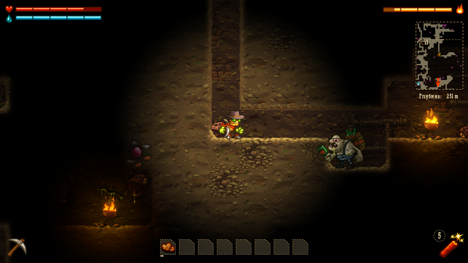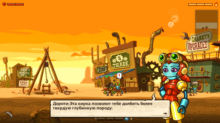 Стоит отметить, что это одна из ранних игр студии Image & Form Games, и, надо сказать, для 2013 года результат получился хорошим. Но разработчикам стоило бы уделить больше внимания наполнению игры. Во время своих приключений Расти будет находить всякое интересное, но всё будет сводиться к тому, чтобы продавать найденные материалы Дороти и покупать улучшения разного рода. Автор понимает, что докапываться до одиннадцатилетней игры — это такое себе решение, но отмечу, что в 2013 году вышли такие игры, как Don't Starve, Joe Dever's Lone Wolf и Rogue Legacy. Что мешало на манер Rogue Legacy ввести в игру постройку сооружений, которые также влияли бы на прокачку героя, только выглядело бы это как обживание дома-шахты.