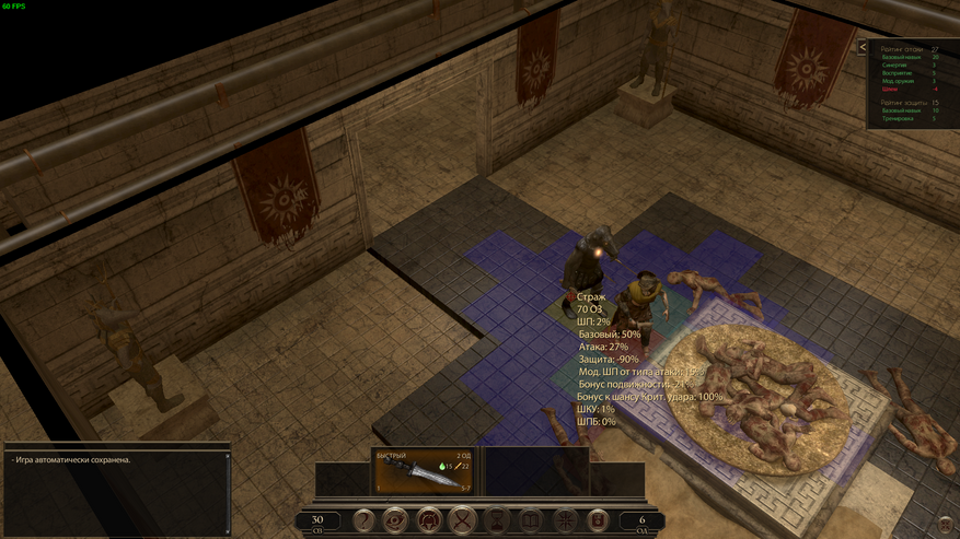 уровень владения оружием, полученные дебаффы, доспехи противника