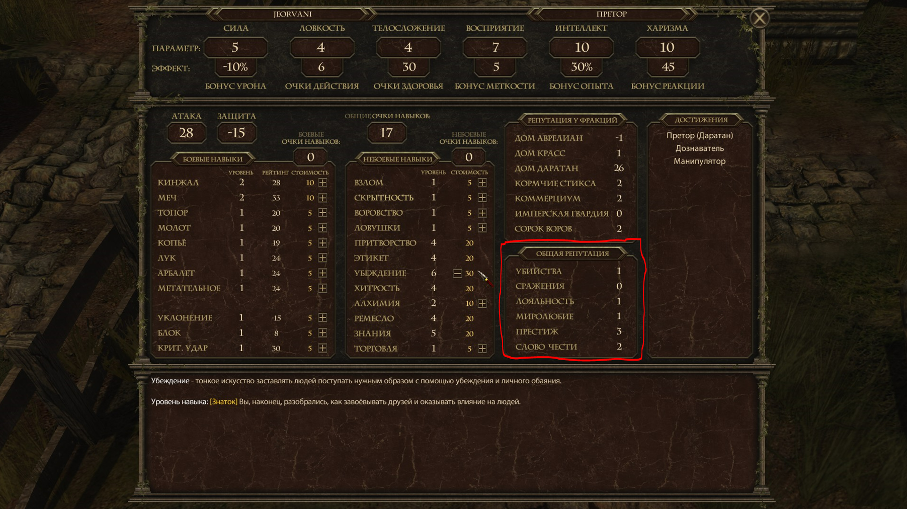 Последним инструментом для формирования отыгрыша роли является — общая репутация. Частично формируется на этапе предыстории, потом развивается от действий игрока. Каждая категория напрямую зарабатывается от действий игрока. Тут сразу приведу пример: играя за благородного отпрыска случайно забрёл в трущобы и конечно же ко мне подошли потолковать за шмот, диалог с самого начала пошёл плохо и одной из строчек диалога стала возможность припугнуть местных своей репутацией убийцы, выбрав её надо мной только посмеялись, ведь к тому моменту напрямую я никого не убил и пришлось огребать последствия в виде кривых и ржавых ножей в бок.