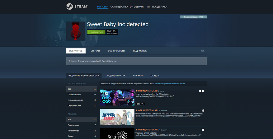 Всё началось с того, что в Steam появился отдельный куратор, который начал помечать проекты, к которым приложили руки ребята из Sweet Baby Inc. Разумеется, представителям компании это не понравилось, и они призвали удалить, заблокировать, отменить — всё как мы любим. Тем не менее, реакция последовала полностью обратная и критика свалилась именно в сторону Sweet Baby Inc, заставив их закрыть или даже удалить свои странички из разных социальных сетей. А кое-где их и вовсе забанили. Впрочем, думаю, вы об этом уже слышали.