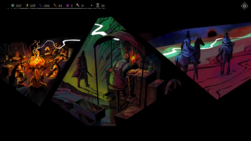 Для перемещения по локациям тратиться такой ресурс как «еда», но его можно либо купить в городах, либо собрать самому, отправляя Охотников на разведку. При выборе точки назначения можно увидеть её описание и историческую сводку о том, что здесь происходило раньше, а также количество ресурсов, добываемых здесь. Где-то хорошо «фармится» еда, а где-то, необходимые для крафта ритуальные и механические части.