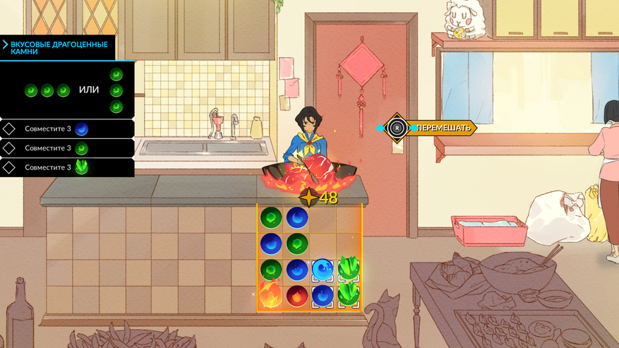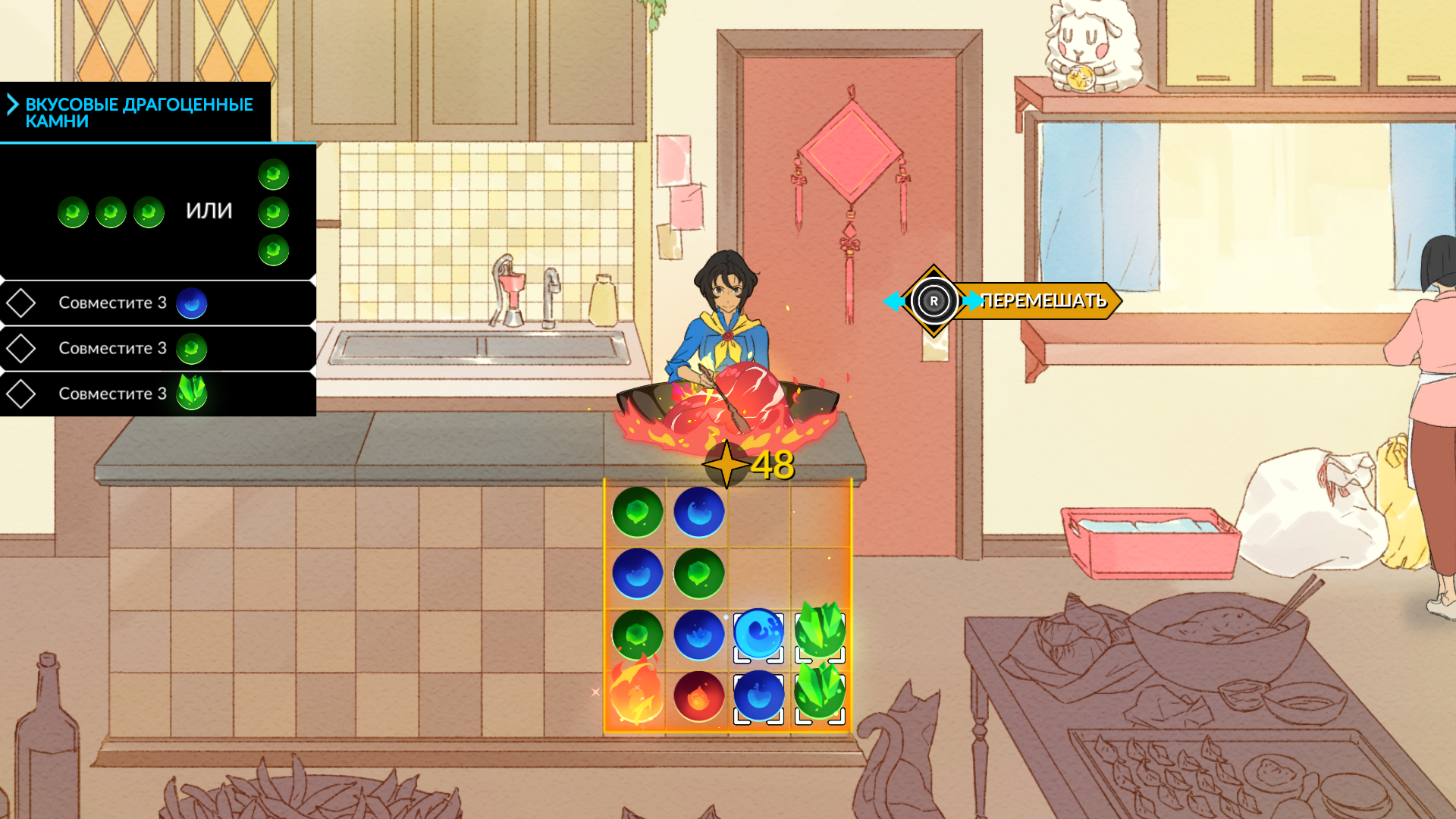 Это было до той поры, пока разработчики не начали игрока заставлять проходить сюжетные мини-игры. Местный старец просит о помощи в приготовлении новых приправ, и чтобы их создать, нужно решать головоломки с теми же «три в ряд», но камни будут ломаться, и придётся начинать по новой.