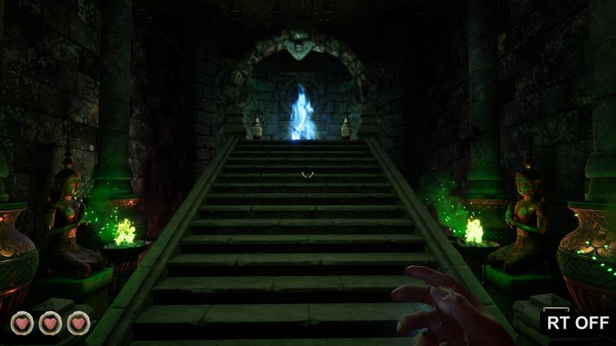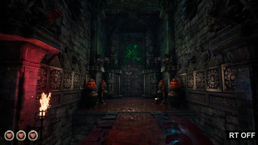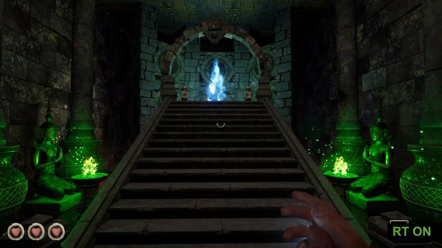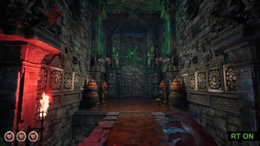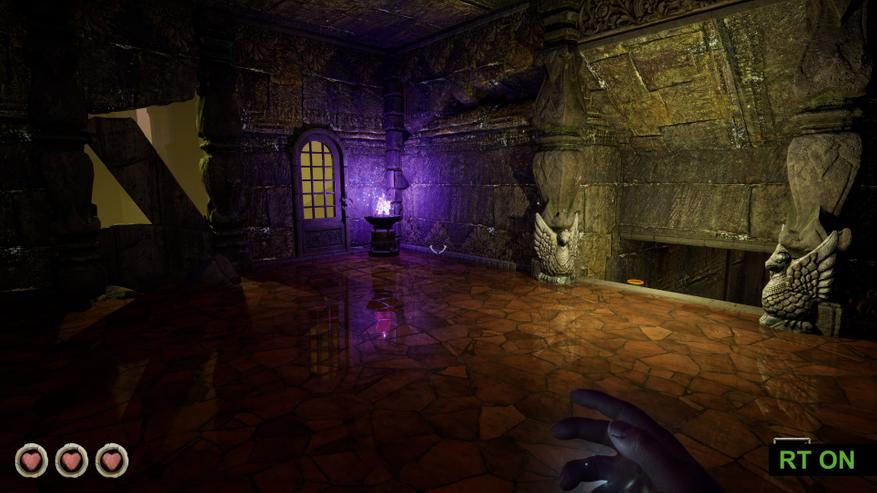 При активной трассировке некоторые зоны в игре становятся ярче. Это хорошо видно по нижнему примеру, где верхний свет и свет от факела интенсивнее подсвечивают все видимое пространство перед нами.