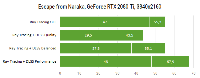 Включение лучей просаживает производительность более чем в два раза. Результаты GeForce RTX 2080 Ti в таком режиме неудовлетворительные, но спасает масштабирование DLSS. При рабочем разрешении 1440p достаточно включить качественный режим DLSS для достижения комфортного уровня производительности и высокой частоты кадров.