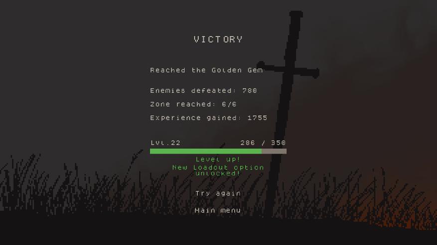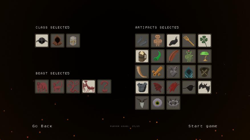 В начале доступна лишь базовая "конфигурация" персонажа, которую можно улучшить, получая драгоценный опыт, заработанный в жестоких схватках во время забега. Начальный капитал всегда доступен и хранится в сундуке, который можно разбить и забрать причетающееся. Как говорилось ранее, в игру присутствует механика проклятий, которая увеличивает ценность прохождения каждой зоны - чем больше наложил на себя проклятий, тем больше золота получишь (если выживешь).