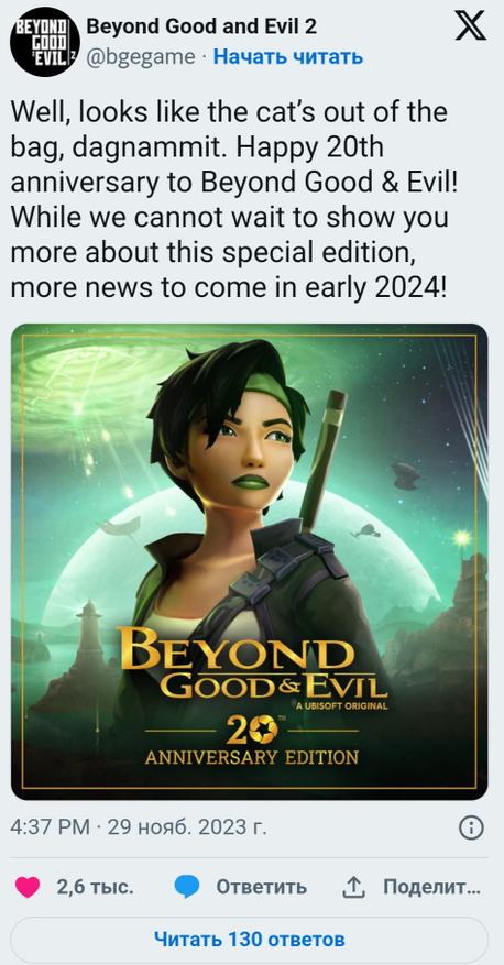 Ранее произошла утечка о готовности Ubisoft выпустить юбилейное издание к игре Beyond Good & Evil под названием 20th Anniversary Edition. Сегодня же компания официально подтвердила слухи в официальном twitter игры.