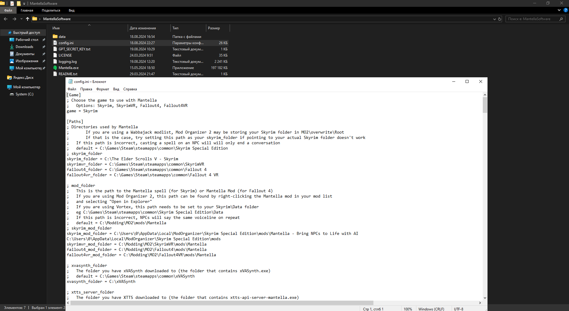 13. Открываем текстовым редактором файл config в папке с Mantella Software и переходим к настройкам программы.