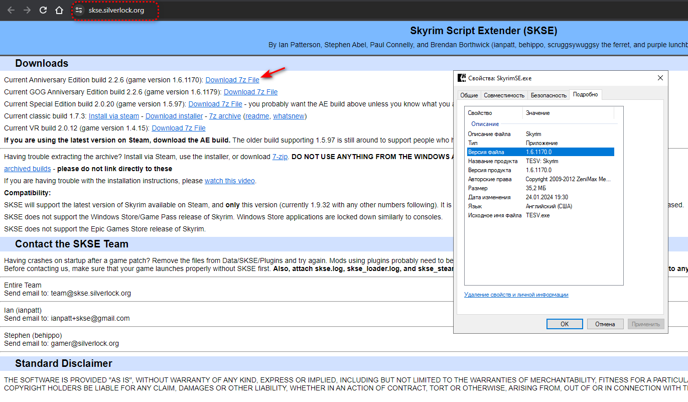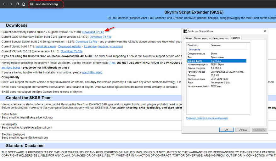 2. Скачиваем SKSE и распаковываем файлы архива в папку с игрой. Файл skse64_loader.exe должен находиться в одной папке с SkyrimSE.exe.