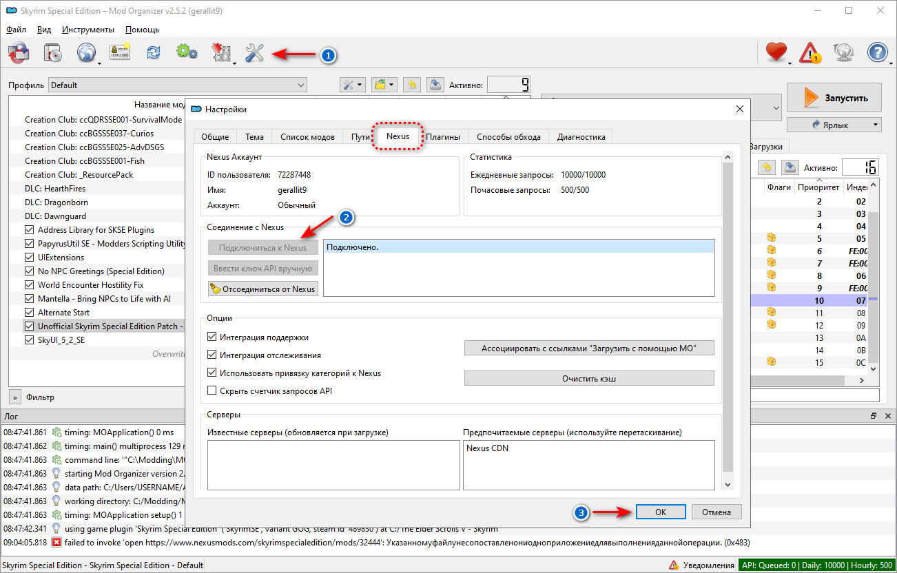 4. Запускаем Mod Organizer 2 и в настройках программы подключаемся к Nexus.