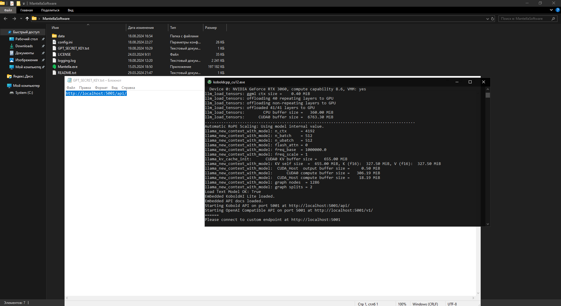 4. Если всё прошло хорошо, то вас автоматически перебросит на страницу нейронной сети. Закрываем веб-браузер и переходим в папку с установленной программой Mantella. Открываем тестовым документом файл GPT_SECRET_KEY и вводим http://localhost:5001/api/.
