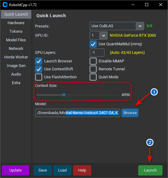 3. Запускаем от имени администратора файл koboldcpp.exe и в появившемся окне указываем путь до скаченной модели. Нажимаем кнопку Launch.
