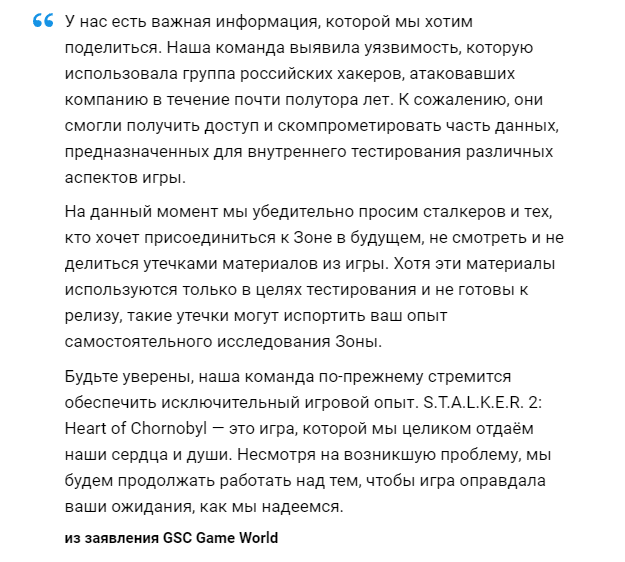 И опять же, что в этом такого? Ну подумаешь, забыли галочку поставить в настройках раздачи. С кем не бывает, человеческий фактор никто не отменял. Да, но… Вчера, первого июня, твиттер аккаунт S.T.A.L.K.E.R. OFFICIAL выложил очень интересный пост. Всё как мы привыкли, отдельная картинка с несколькими абзацами текста. Только в этот раз, вместо привычных извинений, там было написано, что во всём виноваты русские хакеры, совершающие атаки на GSC Game World в последние полтора года. Именно они слили игру, и именно они мешают им её доделать.
