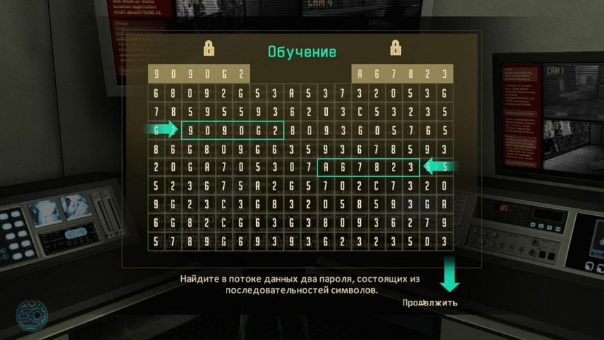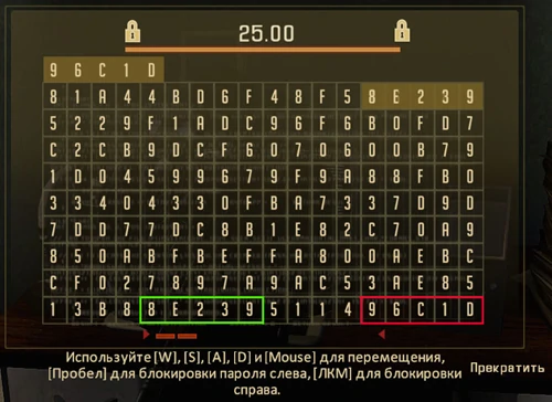 При взломе компьютера, перед вами появляется окно с постоянно меняющимися цифрами и буквами, среди которых нужной найти два столбика со статичными символами. Затем необходимо переместить к ним один из столбцов, находящихся над таблицей с помощью мышки и клавиатуры и закрепить их. В случае промаха у вас уменьшится время на взлом, а со временем местонахождение столбцов в таблице будет меняется.