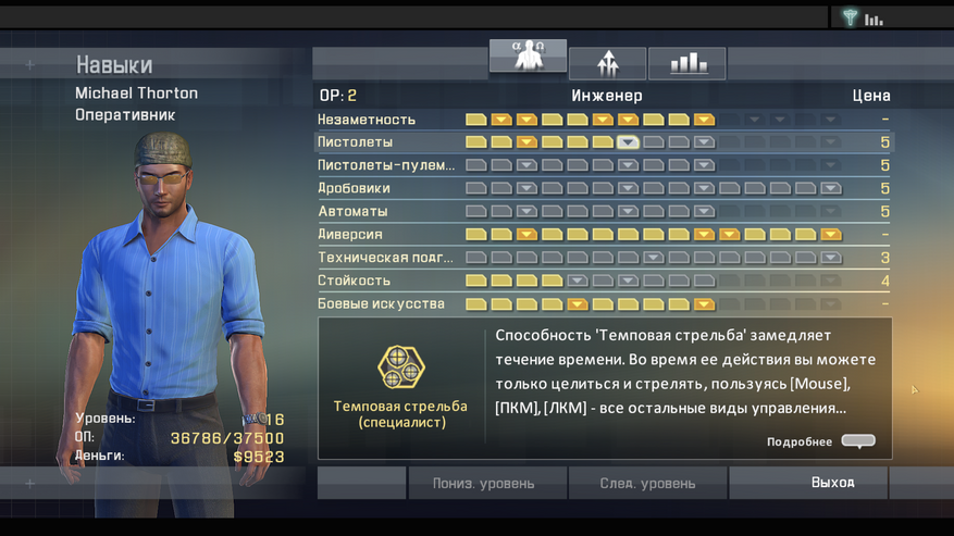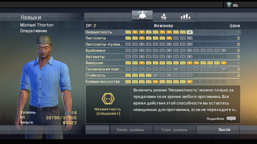 В начале игры вы можете выбрать класс оперативника, от которого будут зависеть начальные вкаченные навыки. Так же можно начать игру за «новобранца», в таком случае у Майкла не будет начальных скилов, но после прохождения вы сможете начать новую игру за прокаченного «ветерана». Примерно в середине игры вы сможете выбрать специализацию агента, от которой зависит максимально возможная прокачка ветки навыков (вложить все очки в ветку скрытности, раскачать её на максимум и бесшумно устранять врагов толпами не выйдет, придётся качать разные навыки.