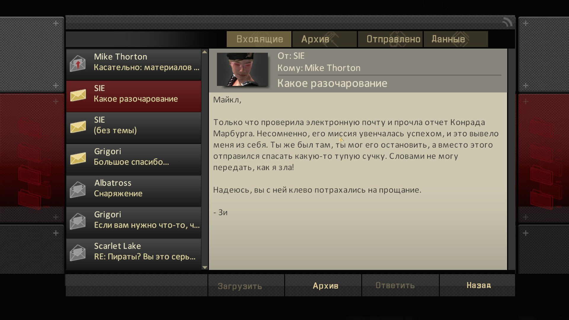 После некоторых событий в игре вам могут приходить электронные письма. На которые можно отвечать по-разному, только здесь вы будете видеть отправляемый текст. В письмах могут быть сведенья для досье на разных персонажей, некоторые помогут заработать, но большинство сообщений будут просто дополнять события, развивающиеся в игре.