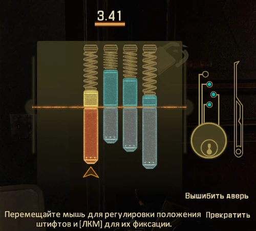 Взламывать двери гораздо проще: вам необходимо двигать мышкой вверх и вниз, чтобы зазор между частями замка оказался посередине.