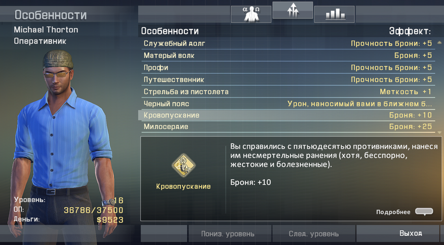 Ещё можно рассказать про мини-достижения, которые немного повышают характеристики персонажа. Например, если вы убили 50 противников из пистолете, то у него снизиться отдача, а если вы 10 раз использовали в диалоге опцию «профессионализм», то все умения будут перезаряжаться быстрее и тп. Это не сильно влияет на геймплей, но все равно приятно.