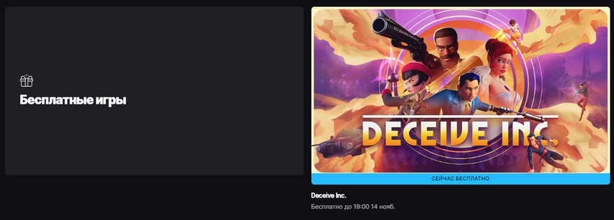 Стоит отметить, что Epic Games Store немного изменил время начала своих бесплатных раздач — теперь игры становятся доступными в 19:00 по московскому времени, а не в 18:00, как это было раньше. Пользователям в России, к сожалению, доступ ко всему кроме Deceive Inc. ограничен.