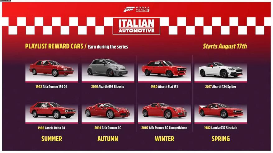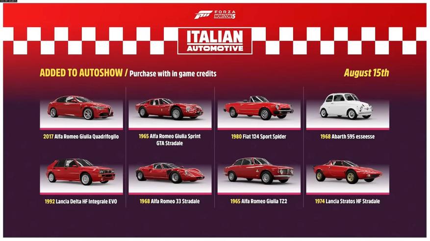 Alfa Romeo, Lancia, Fiat и Abarth наконец-то появились в Forza Horizon 5. 8 новых моделей этих марок игроки получат уже 15 августа 2023 года, а следующие восемь будут разблокированы постепенно. Кроме того, есть еще одно DLC, включающее 7 суперкаров из Италии.