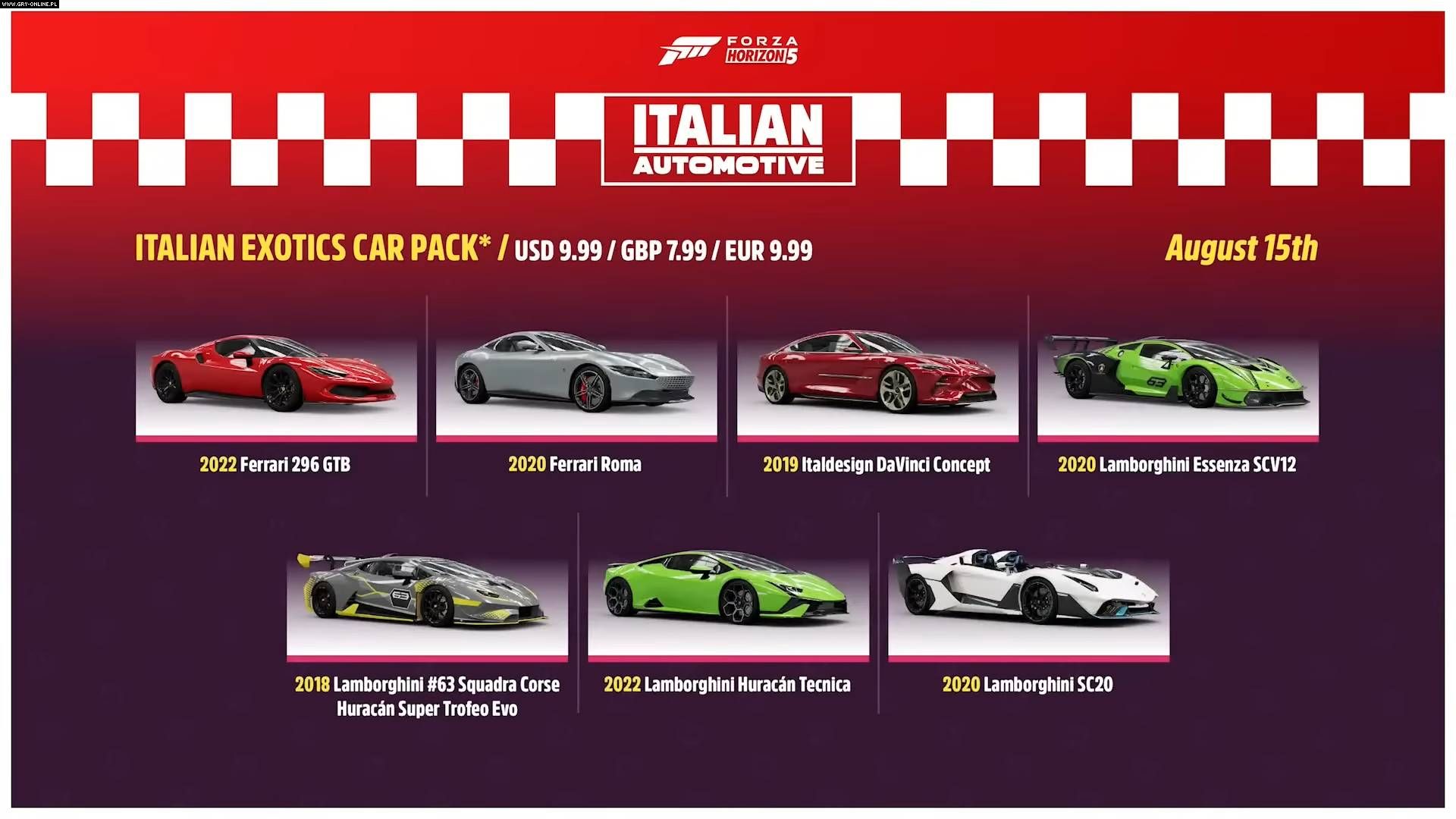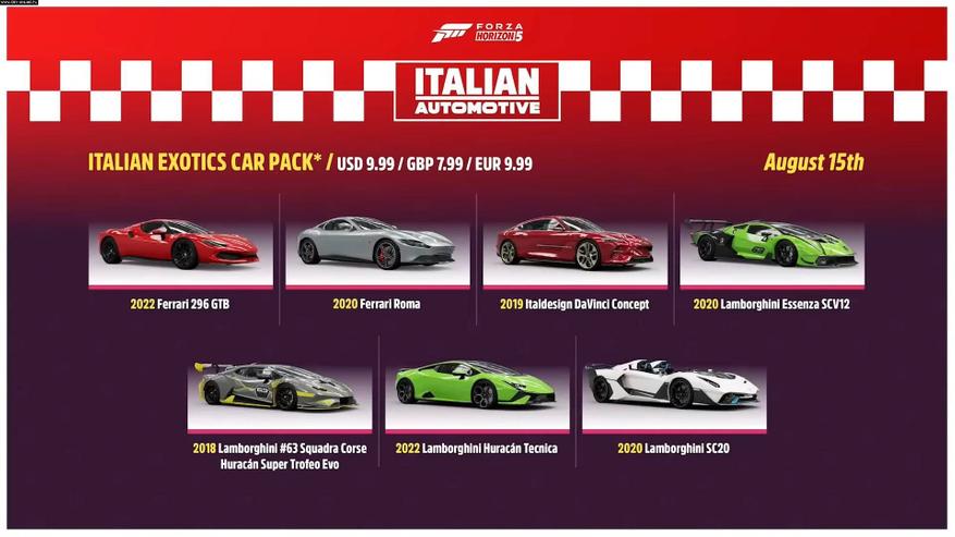 Компания Playground Games продолжает делать деньги на новых автомобилях и выпускает очередное DLC под названием Italian Exotics Car Pack. На этот раз геймеры получат семь автомобилей, а цена подскочит до €9,99 или 1 078,62 руб. на 14 августа 2023 года.
