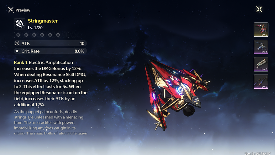 - Когда навык резонанса наносит урон, АТК повышается на 12%, эффект складывается 2 раза и длиться 5 секунд. Когда резонатор(персонаж) не на поле боя эффект дополнительно повышается на 12% АТК.